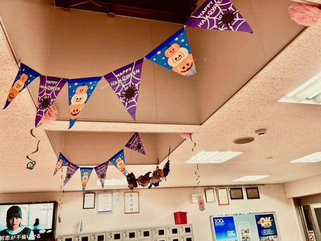 藍住校ではハロウィンの雰囲気を出して、楽しく運動やレッスンをしていただくために館内を飾りつけしました💕