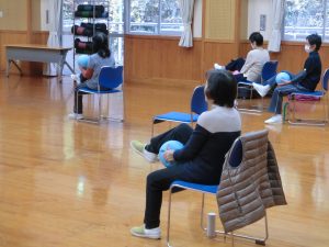 またボールを握り、手足を同時・交互に動かす「リズム体操」を行いました。