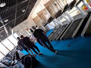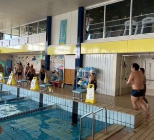 プールやトレーニングを利用していた方は一時中断し、コーチ達が誘導しながら