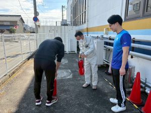 消火器の使い方や注意事項の説明を受けて