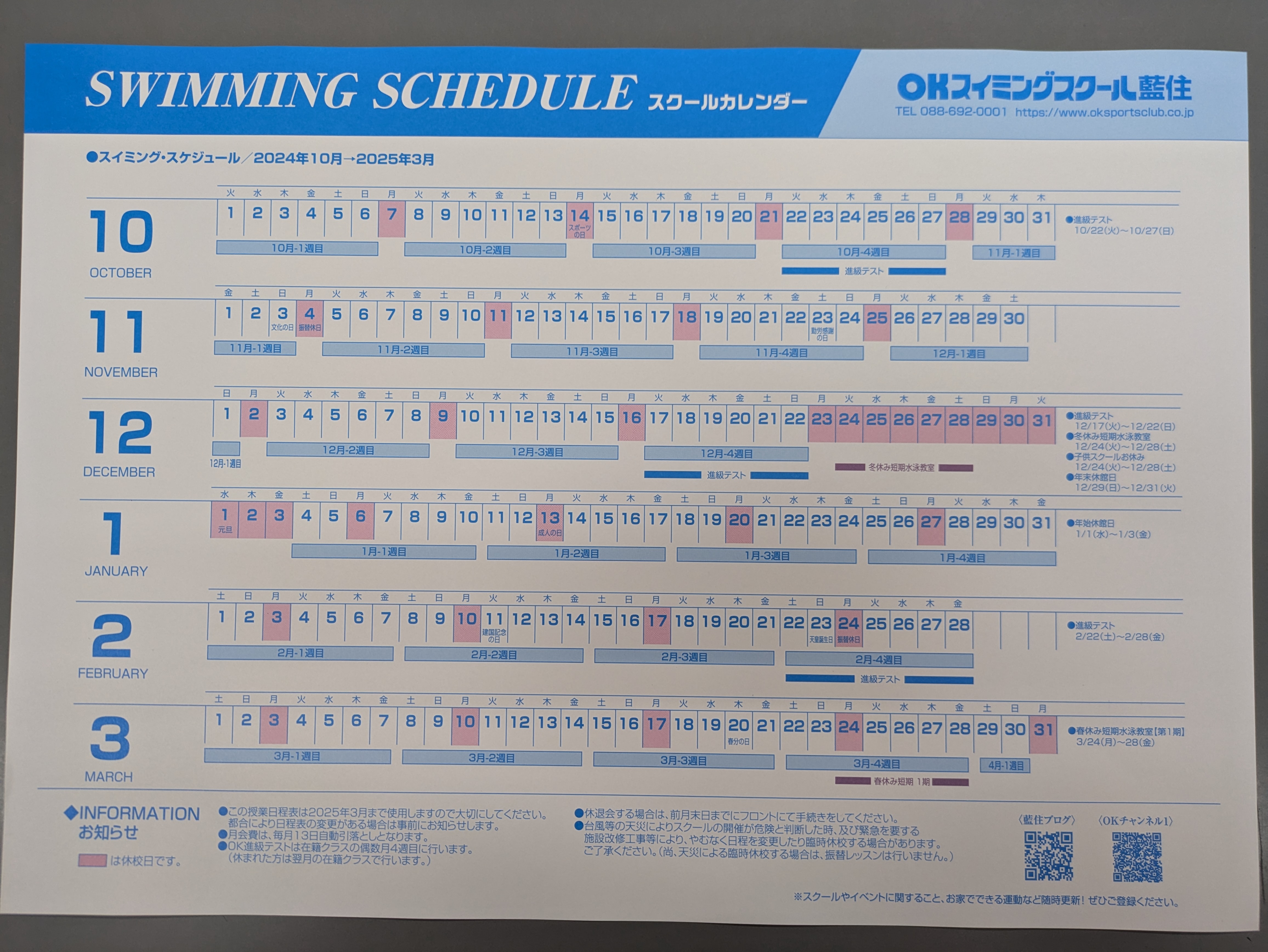 ピンクの箇所はスクールがお休みとなっています♪