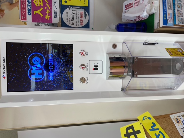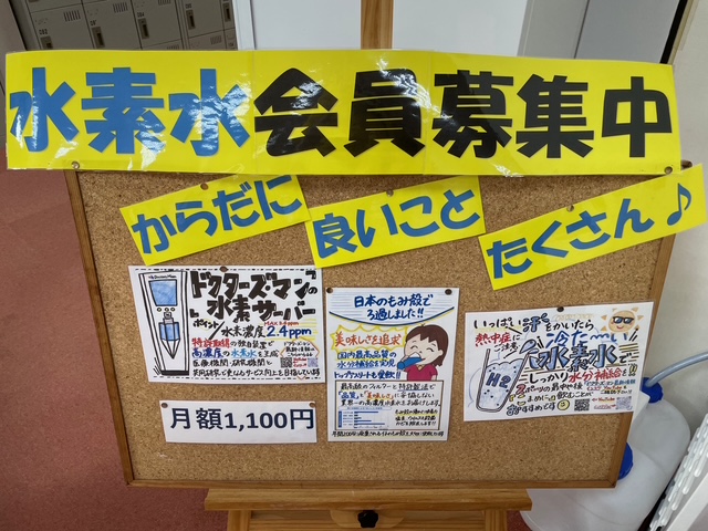 また月1100円で飲み放題の水素水サーバー『ドクターズマン』を設置してます。550円の専用ボトルに注いで汗をかいた体に水分を補給しよう!